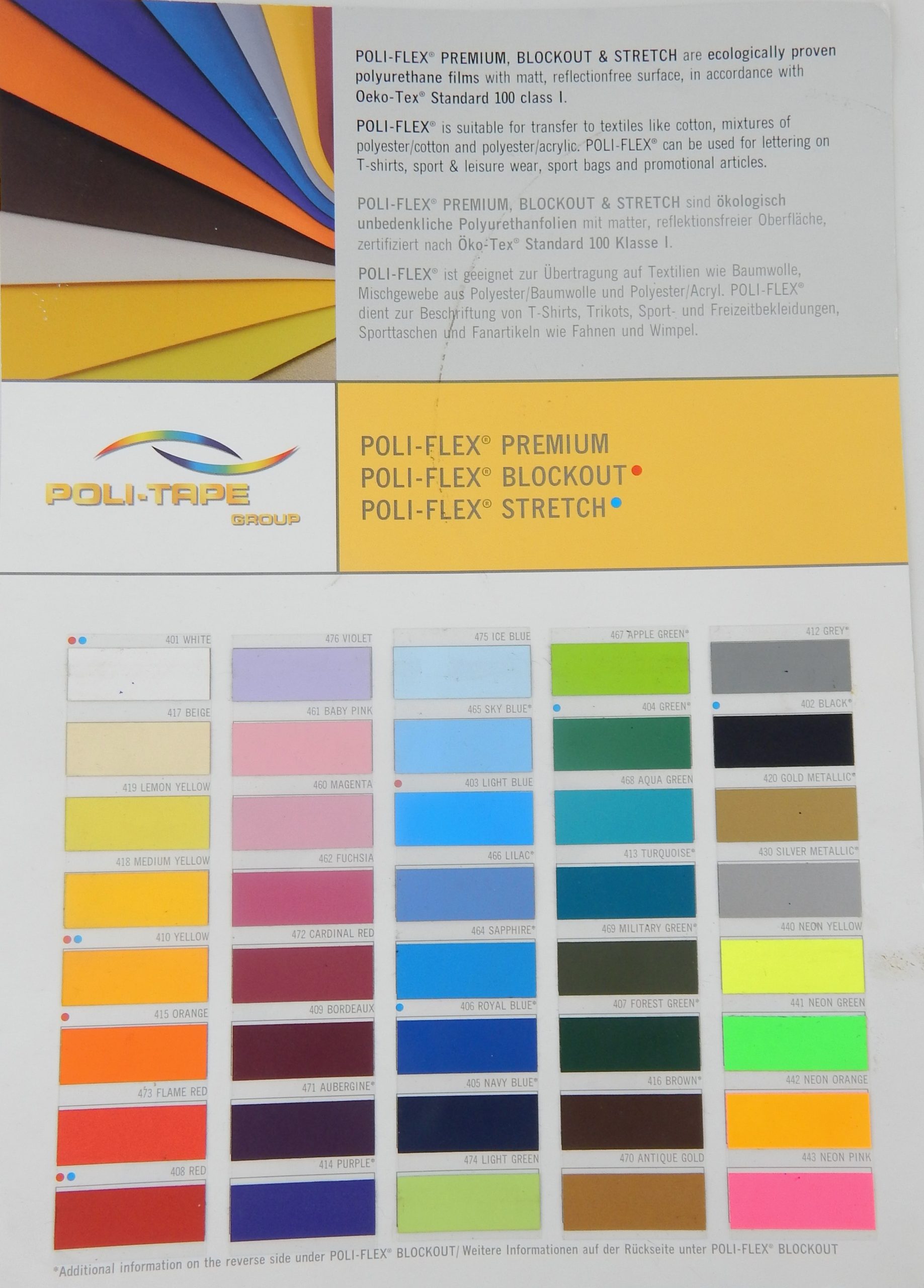 Wysokiej jakości matowa folia poliuretanowa zalaminowana z termicznie aktywowanym klejem. Bardzo dobrze łączy się z takimi materiałami jak: bawełna, mieszanki bawełna/poliester oraz poliester/akryl. Wyjątkiem są nylon i tkaniny impregnowane wodoodpornie. Dzięki elastyczności i miękkości jest przyjemna w dotyku. Nie odbija światła. Materiał Poli-flex Premium jest przyjazny dla środowiska, nie zawiera PCV, plastyfikatorów oraz metali ciężkich.