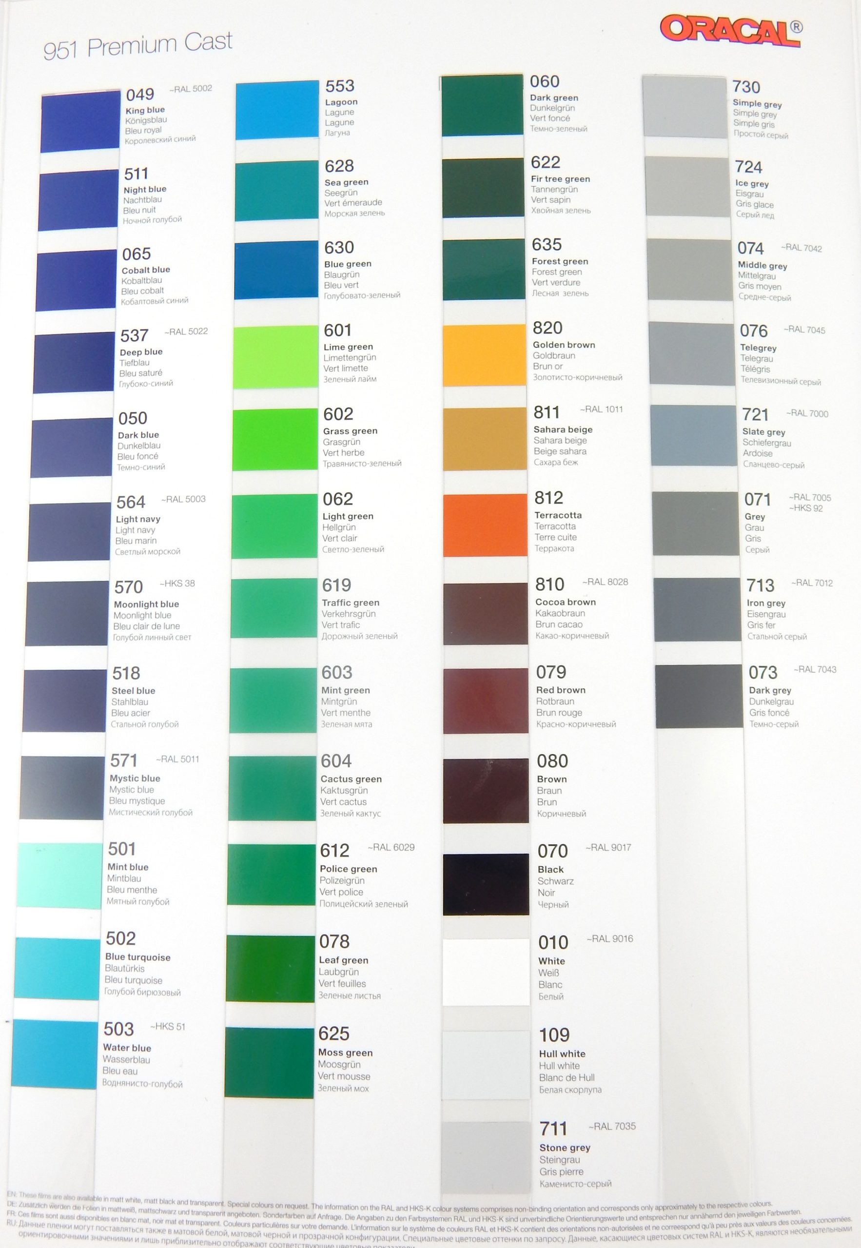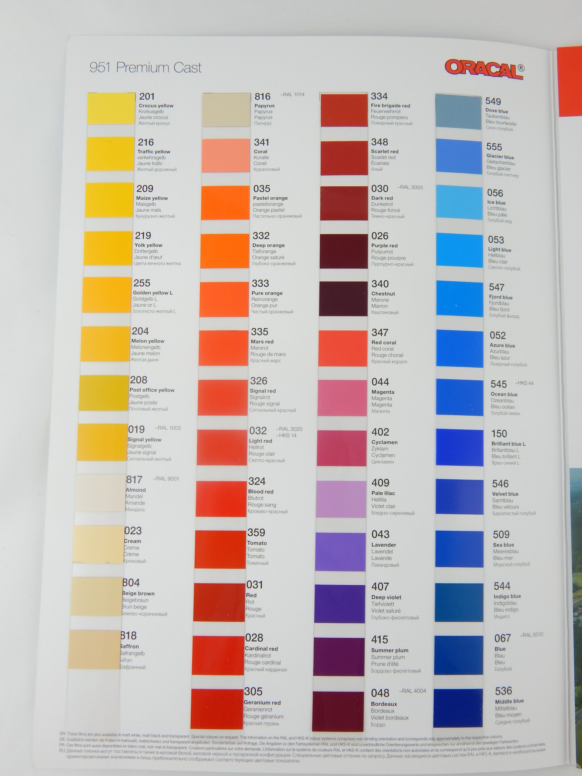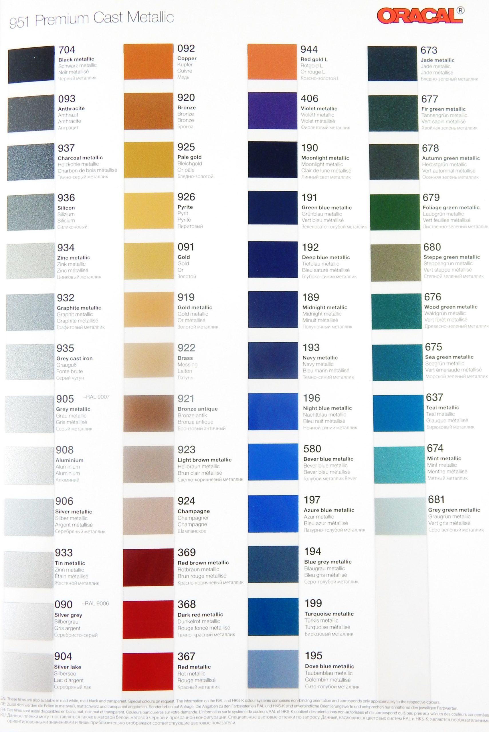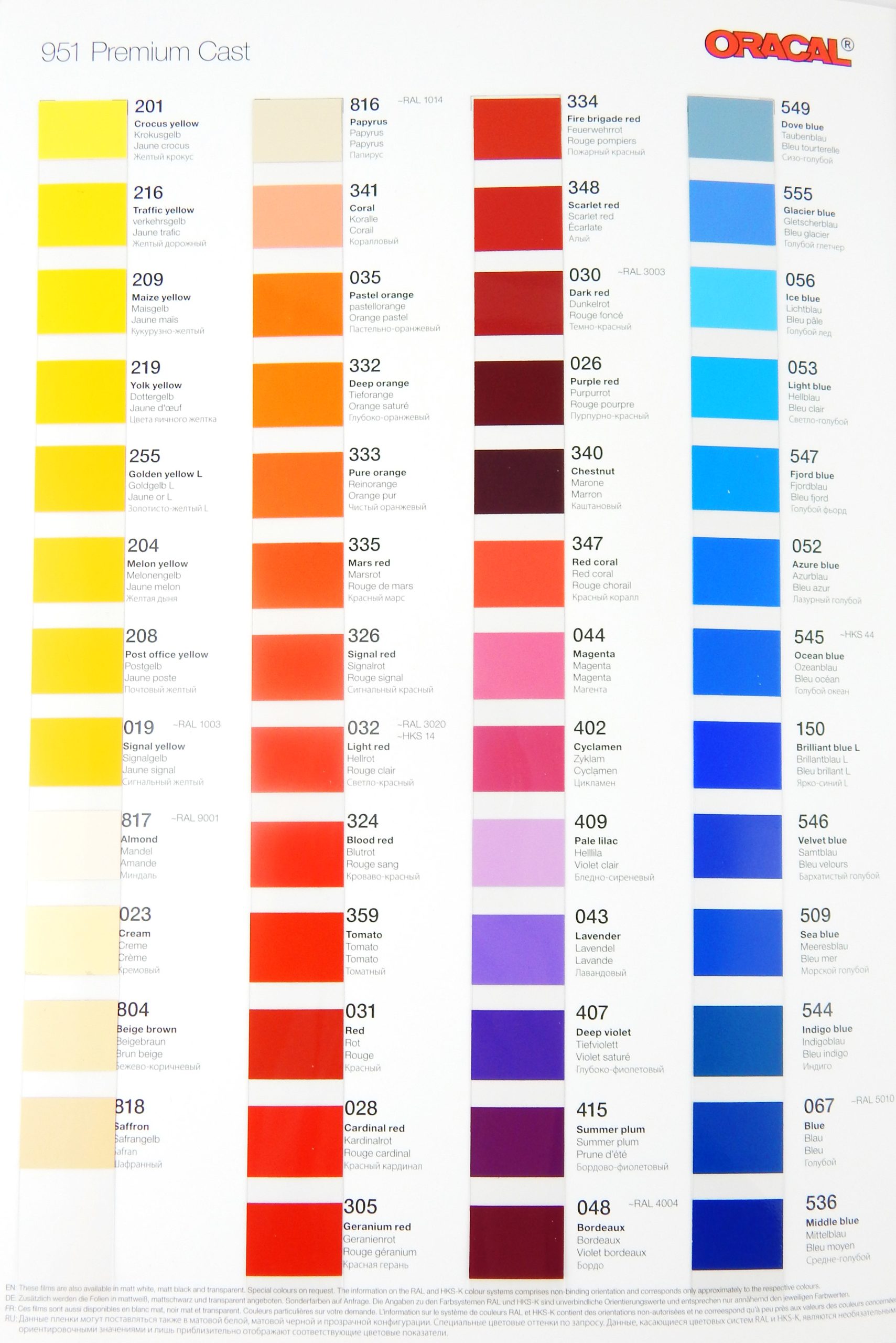 Wzornik folii Oracal 951. Format A4. Cena za 1 szt.